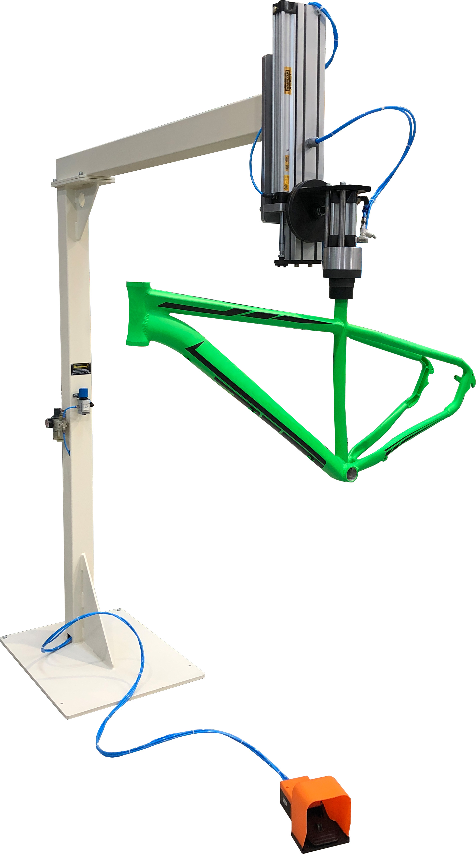 This machine performs column bicycle assembly. Equipped with pneumatic support for frame locking (any internal diameter of the seat tube). It has complete column and controllable manually.