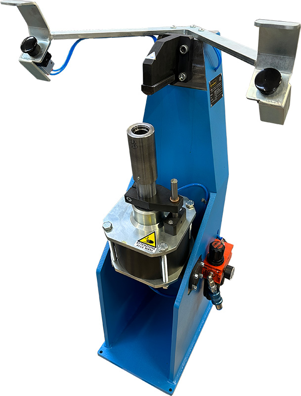 This machine performs cap fitting on the base of the fork crown. Equipped with pneumatic cycle with safety double hand control, it is suitable for any fork types. The machine has an output capacity of 1 fork every 10 seconds.