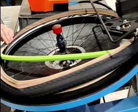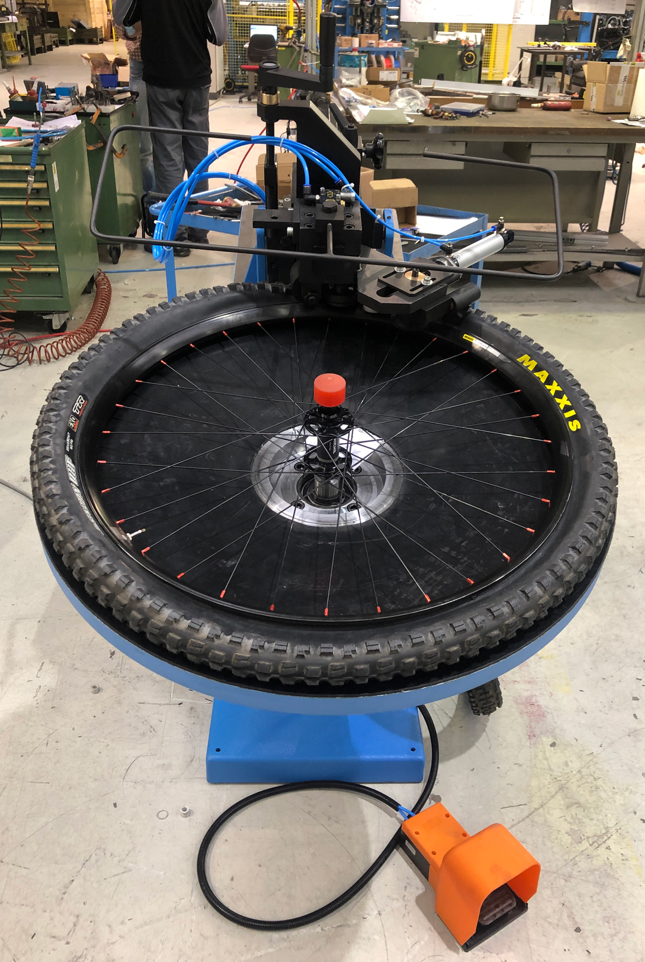 This machine automatically mounts tires/wheels using an electro-pneumatic function. The machine has been equipped with a PLC to manage all the steps of the cycle while the tire is being inserted onto the rim and to ensure safety during each phase of the rubberizing process. Suitable for any type of wheel, including carbon rims and tubeless tires.